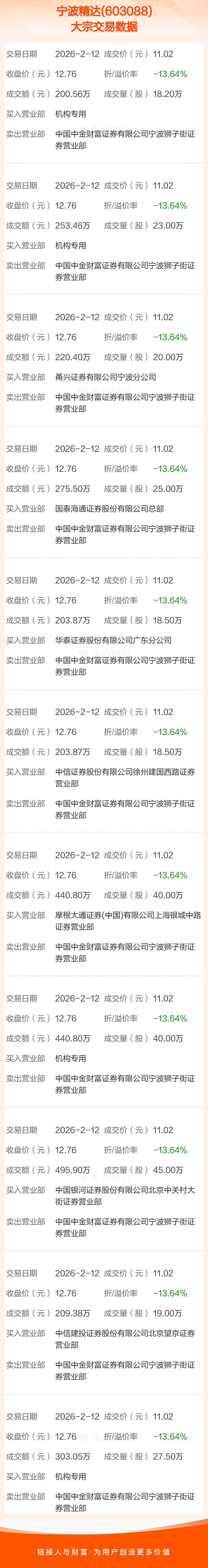 2026年2月12日,宁波精达发生11笔大宗交易,共成交294.70万股,成交金额3247.59万元,占其流通市值比例为0.58%。