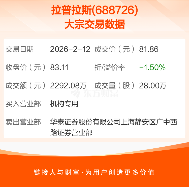 2026年2月12日,拉普拉斯发生1笔大宗交易,共成交28.00万股,成交金额2292.08万元,占其流通市值比例为0.13%。
