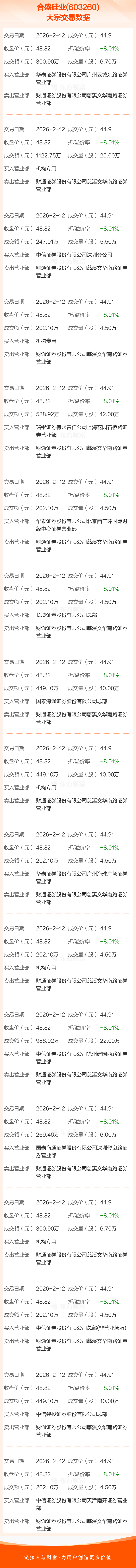 2026年2月12日,合盛硅业发生17笔大宗交易,共成交145.40万股,成交金额6529.96万元,占其流通市值比例为0.11%。