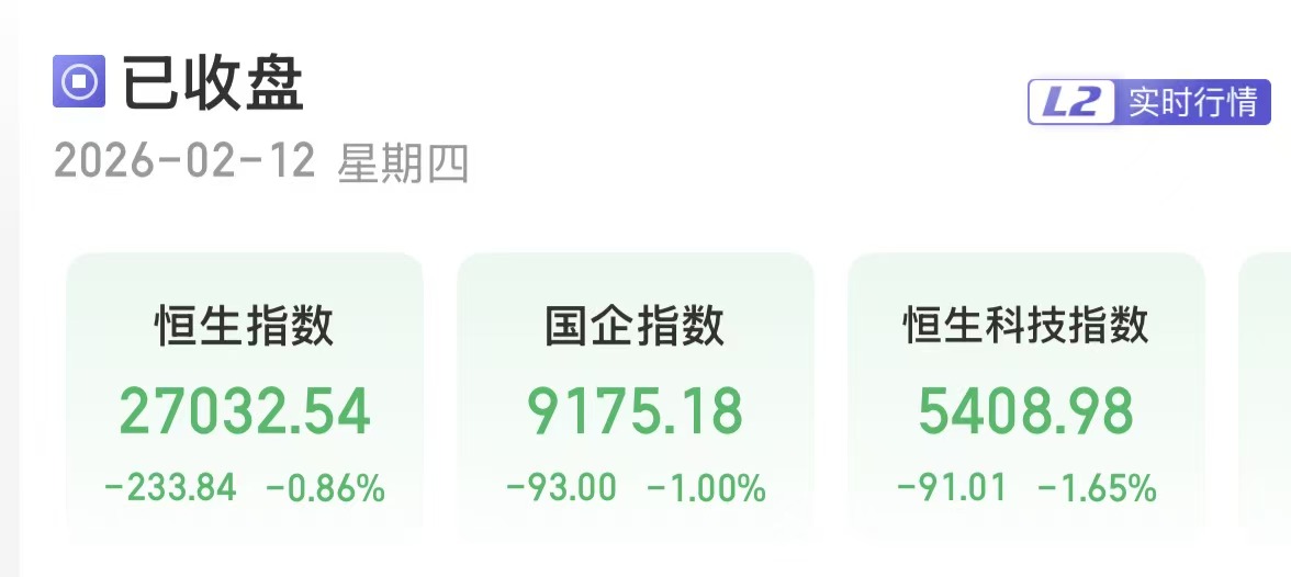 上证报中国证券网讯2月12日,港股三大指数集体收跌。截至收盘,恒生指数跌0.86%,报27032.54点;恒生国企指数跌1%,报9175.18点;恒生科技指数跌1.65%,报5408.98点。