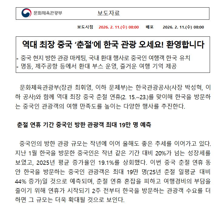 韩国文化体育观光部和韩国观光公社2月11日发布公告预测,在2月15日至23日的中国春节长假期间,访韩中国游客人数日均有望同比增加44%,达19万人,“考虑到部分游客可能为避免高峰在春节假期两周前提前访韩,访韩中国人规模有望进一步增加”。