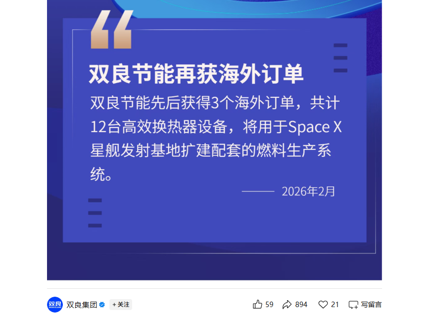 双良节能(600481.SH)发布关于海外订单的说明,2月12日,公司在微信公众号发布了一篇名为《双良节能再获海外订单,助力商业航天太空探索》的市场快讯,文中提及“公司先后获得3个海外订单,共计12台高效换热器设备,将用于SpaceX星舰发射基地扩建配套的燃料生产系统”。