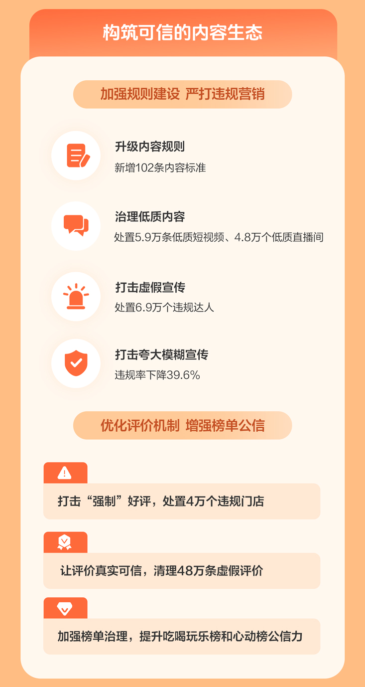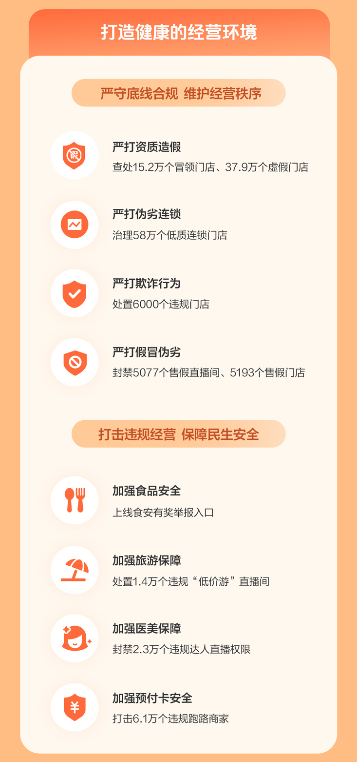 针对低质、虚假和夸大模糊内容,平台持续推进专项治理,累计处置5.9万条低质短视频、4.8万个低质直播间和6.9万个虚假宣传达人。截至年底,夸大模糊宣传违规率下降39.6%。
