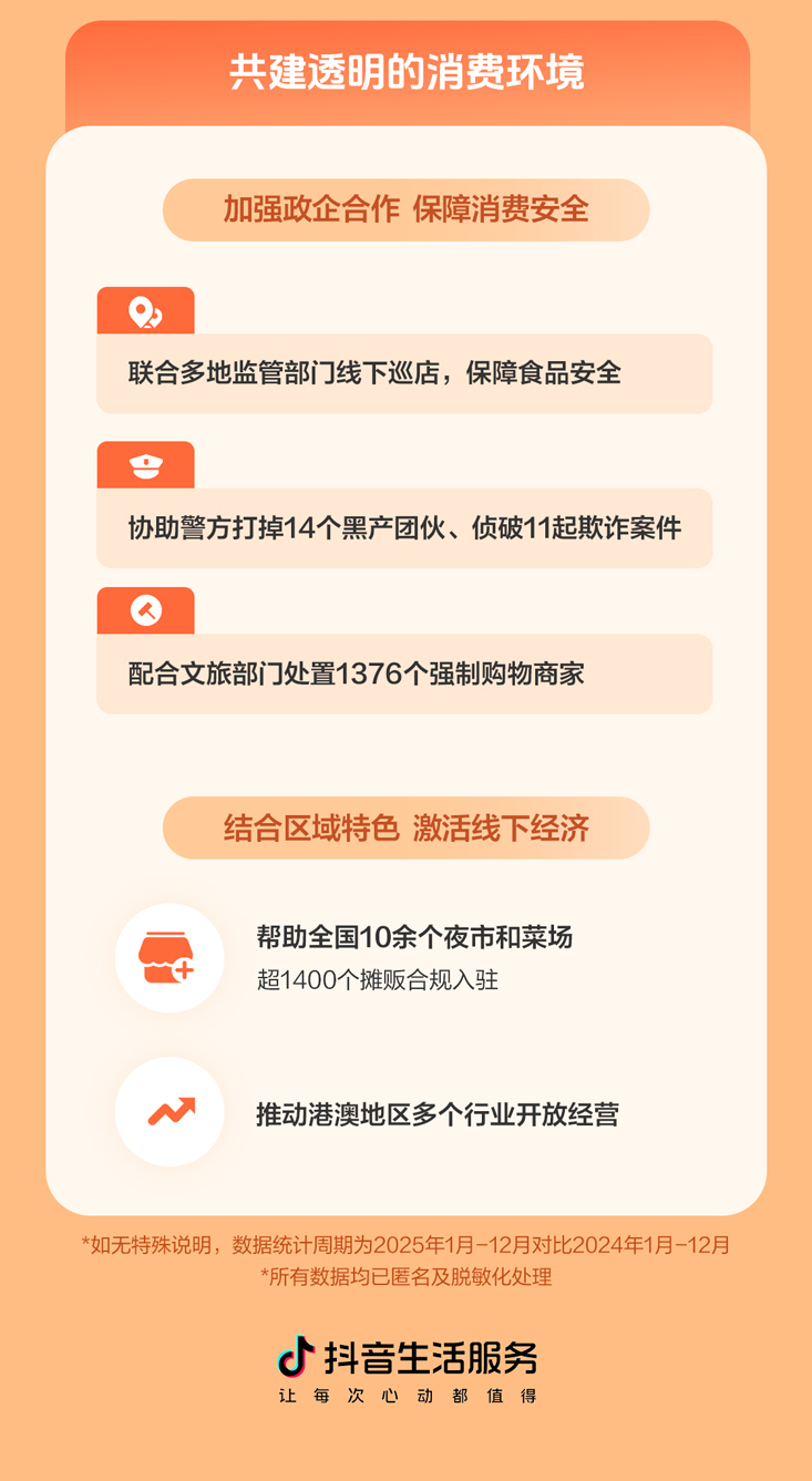 报告显示,抖音生活服务积极加强与社会各界合作,共同推动净化网络消费环境,保障消费者权益,助力线下经济发展。2025年,平台联合多地监管部门线下巡店保障食品安全,协助多地警方打掉14个黑产团伙,侦破11起欺诈案件,配合文旅部门处置1376个强制购物商家。