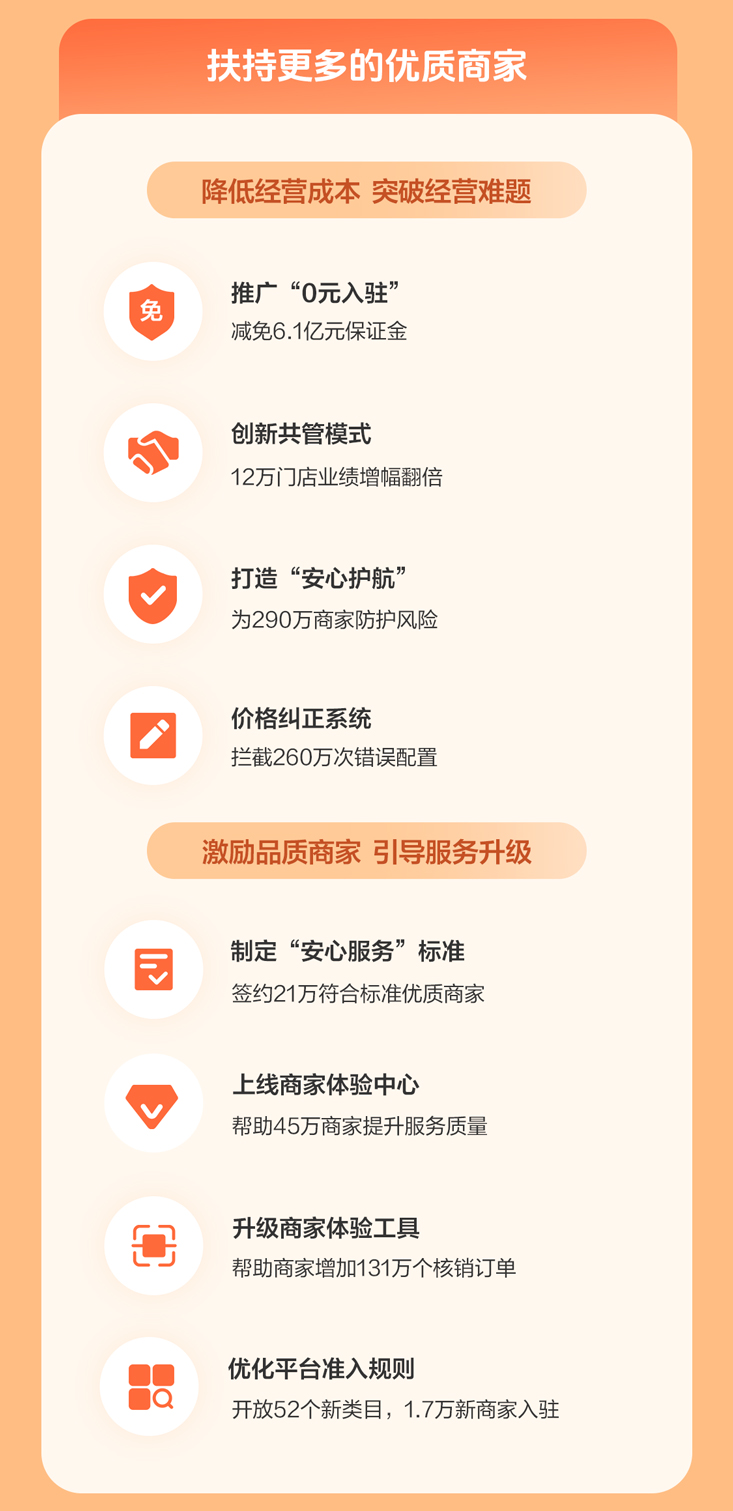 过去一年,平台打造“安心护航”体系,累计为290万商家降低了经营风险。针对价格错误配置等常见问题,平台升级价格纠正系统,累计拦截260万次错误配置,帮助商家减少损失。平台还上线商家体验中心,配套升级商家体验工具,帮助商家从消费者视角思考和解决经营问题。全年累计为45万商家提供服务,帮助其提升服务质量,同时增加了131万个核销订单。