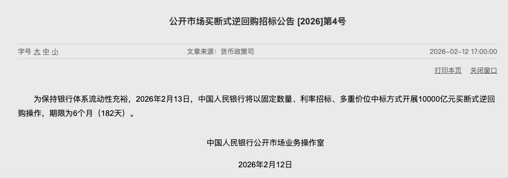 2月12日,央行发布公开市场买断式逆回购招标公告,为保持银行体系流动性充裕,2026年2月13日,中国人民银行将以固定数量、利率招标、多重价位中标方式开展10000亿元买断式逆回购操作,期限为6个月(182天)。