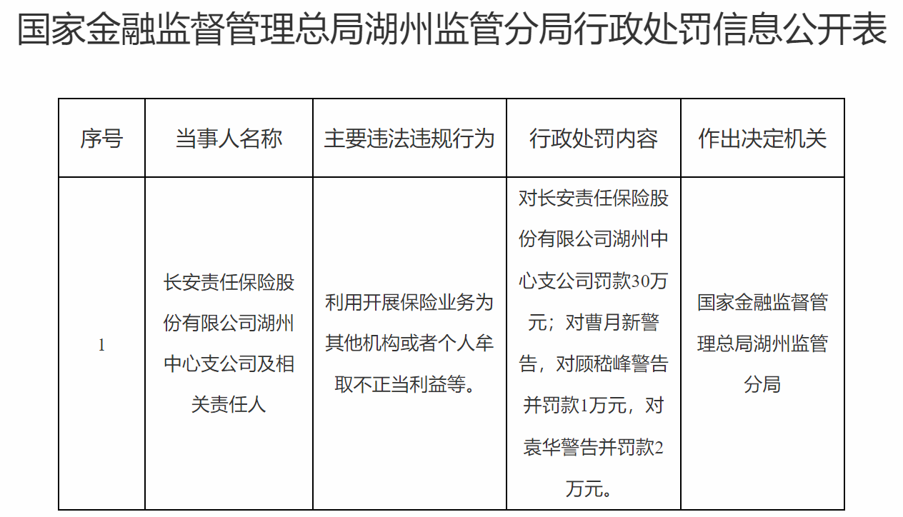 罚单显示,长安责任保险股份有限公司湖州中心支公司的主要违法违规行为是:利用开展保险业务为其他机构或者个人牟取不正当利益等。据此,国家金融监督管理总局湖州监管分局对其罚款30万元;对相关责任人曹月新警告,对顾嵇峰警告并罚款1万元,对袁华警告并罚款2万元。