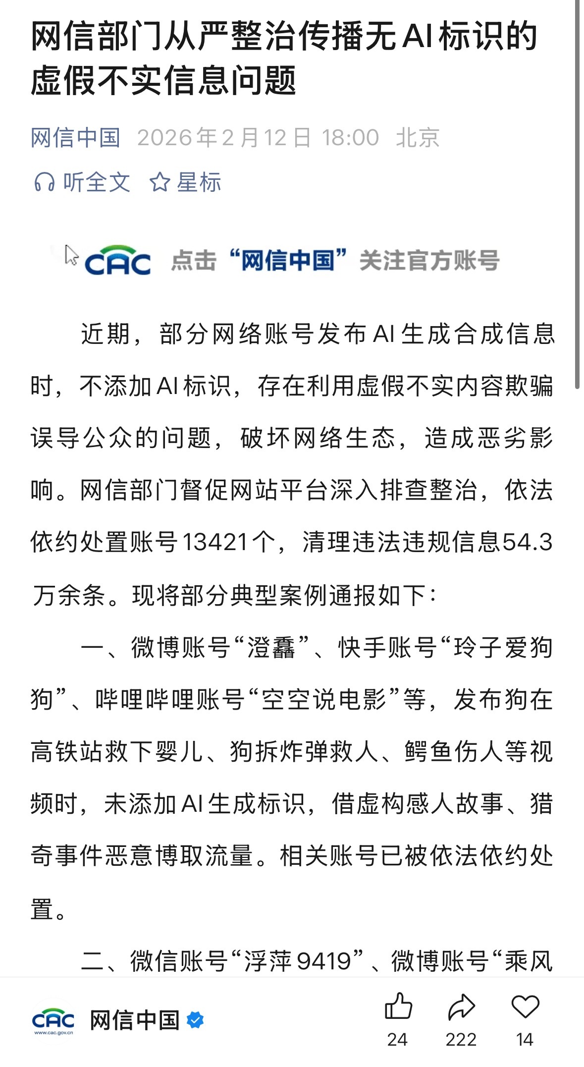据央视新闻2月12日消息,近期,部分网络账号发布AI生成合成信息时,不添加AI标识,存在利用虚假不实内容欺骗误导公众的问题,破坏网络生态,造成恶劣影响。网信部门督促网站平台深入排查整治,依法依约处置账号13421个,清理违法违规信息54.3万余条。现将部分典型案例通报如下: