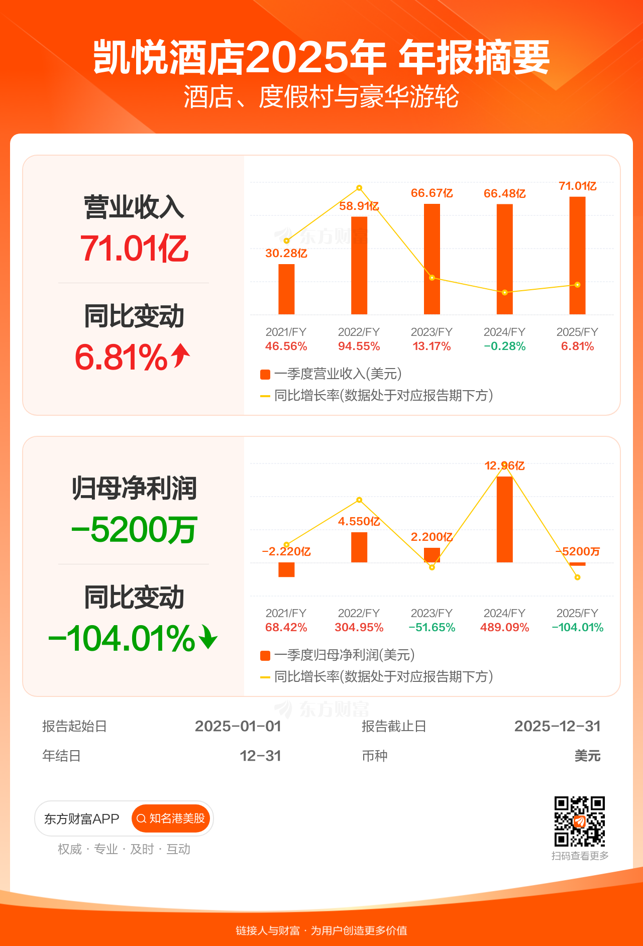 凯悦酒店2月12日发布年报业绩,截至2025年12月31日的12个月内,该公司营业收入71.01亿美元,同比增长6.81%;公司权益持有人应占溢利(归母净利润)-5200.00万美元,上年同期12.96亿美元。