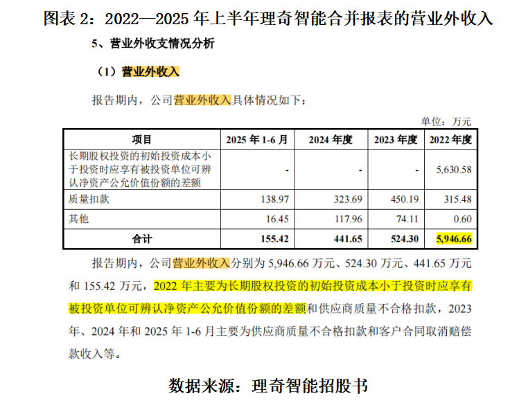 另外,该回复文件还显示,通过并表,理奇智能还在2022年的利润表中,将长期股权投资时的初始投资成本小于投资时应享有被投资单位可辨认净资产的公允价值份额的差额,确认为营业外收入5630.58万元。