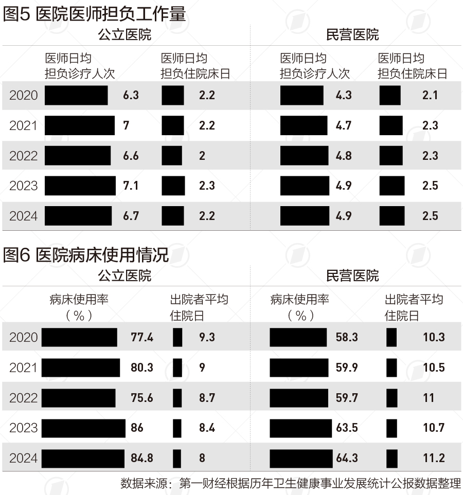 2020~2024年,公立医院人员数从621.3万增加到705.1万,其中卫生技术人员从529.2万增加到608.4万。2024年,公立医院医师日均担负诊疗人次为6.7人次,日均担负住院床日为2.2天。