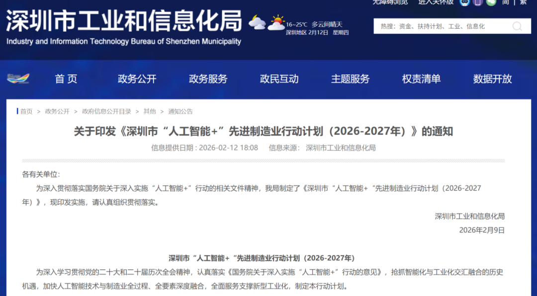 据深圳市工业和信息化局官网,该局制定了《深圳市“人工智能+”先进制造业行动计划(2026-2027年)》(以下简称《行动计划》)。