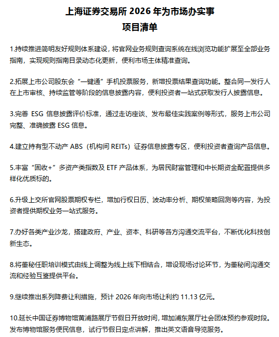 2月12日,上交所正式发布《上海证券交易所2026年为市场办实事项目清单》,该清单包括五个方面十件“实事”,覆盖上交所上市审核、一线监管、产品创新、市场服务、投资者保护、信息技术等主要业务领域,持续深化“开门办审核、开门办监管、开门办服务”工作。