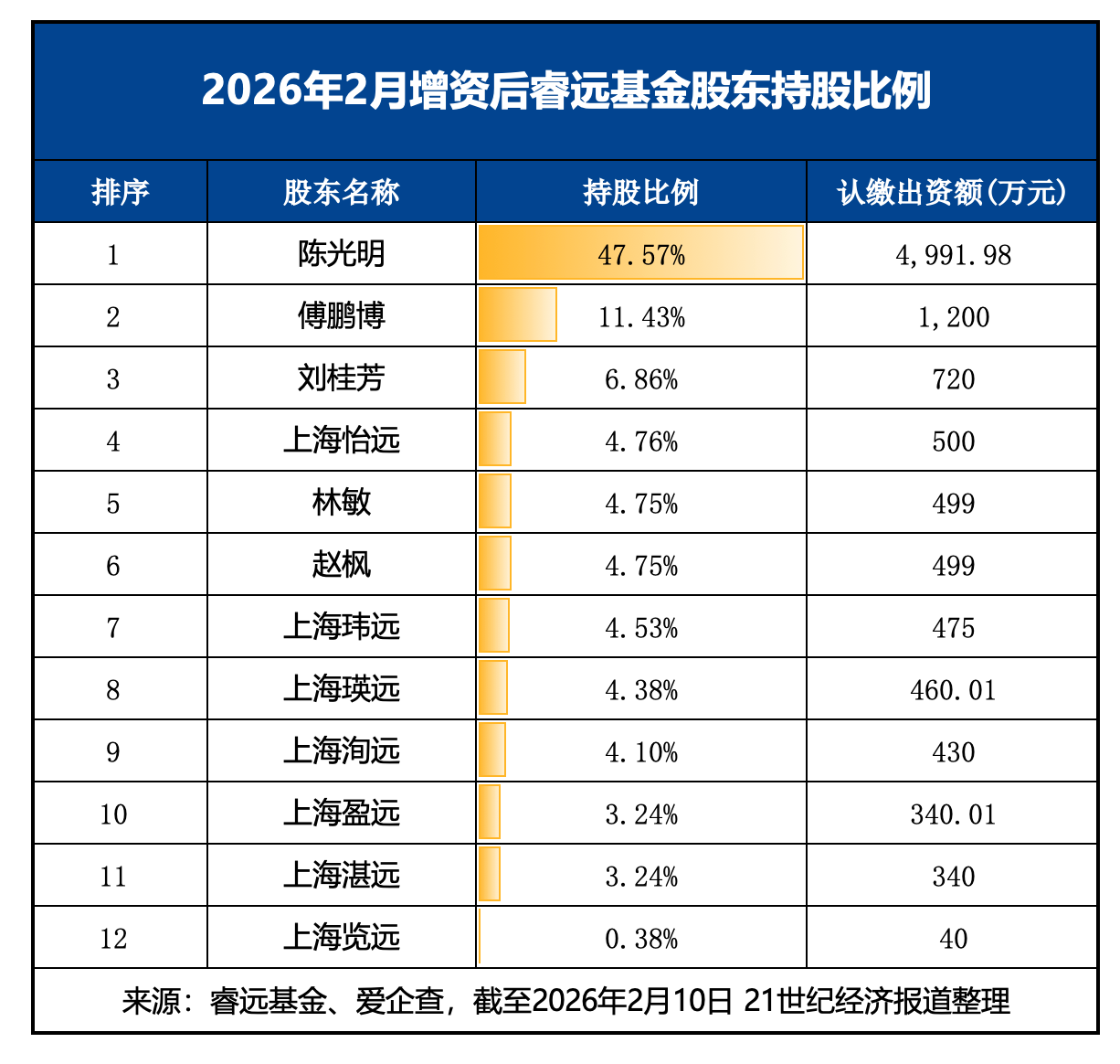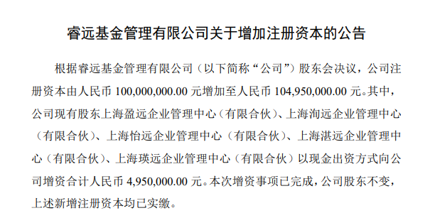 2月10日,睿远基金发布关于增加注册资本的公告。公告显示,公司注册资本由1亿元增加至1.0495亿元,五家员工持股平台合计增资495万元。本次增资事项已完成,陈光明、傅鹏博等仍是持股比例居前的股东。