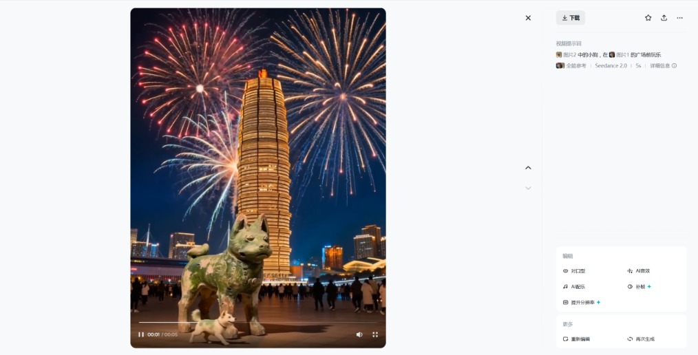 大河财立方记者实测发现,在即梦平台上上传一张郑州新地标大玉米楼的图片和一张小狗的图片,并输入提示词“图片2中的小狗,在图片1的广场前玩乐”。生成的视频中,大玉米楼所在的广场人来人往,烟花在黑夜中绽放,一只青铜小狗和一只白色的小狗出现在广场上。