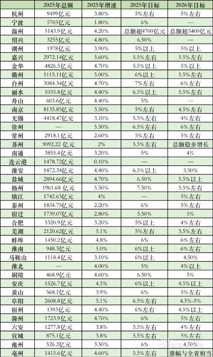 不过,杭州、湖州、嘉兴、常州依然延续了2025年的增速目标:杭州目标2026年社会消费品零售总额增长5%左右、突破1万亿元,湖州目标增长5%以上,嘉兴目标社会消费品零售总额增长5.5%左右,常州目标社会消费品零售总额增长5%左右。