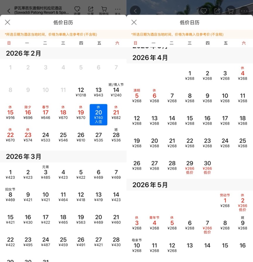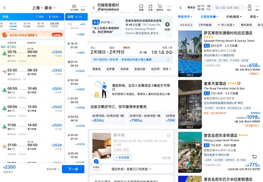 以上海到曼谷、大年初一出发为例,往返机票价格普遍在2000-4000元左右,再也不是几百一千块能够搞定的了。如果要住在普吉岛,类似芭东海滩这类热门位置附近的酒店普遍在人民币大几百元至千元以上一晚,部分酒店春节期间多个晚上的房间已经订满。
