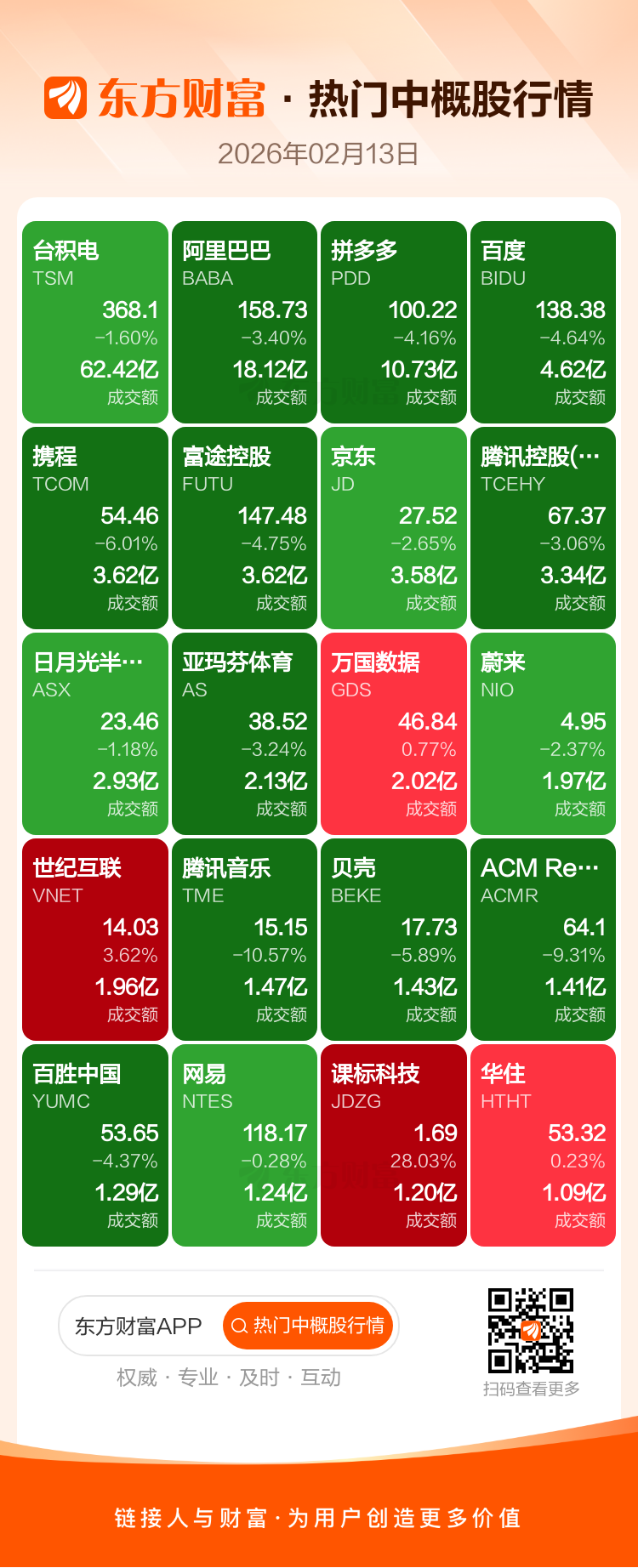 台积电跌1.60%,阿里巴巴跌3.40%,拼多多跌4.16%,百度跌4.64%,携程跌6.01%,富途控股跌4.75%,京东跌2.65%,腾讯控股(ADR)跌3.06%,日月光半导体跌1.18%,亚玛芬体育跌3.24%。