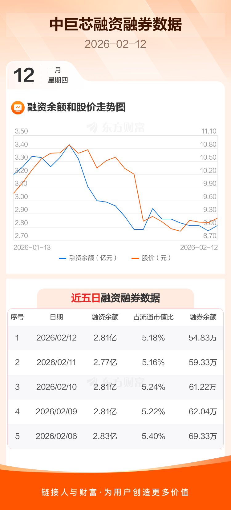 交易所最新数据显示,中巨芯于2026年2月12日获融资买入2114.13万元,融资偿还1709.11万元,当日融资净买入405.02万元。目前,该股融资余额2.81亿,占流通市值比例为5.18%。