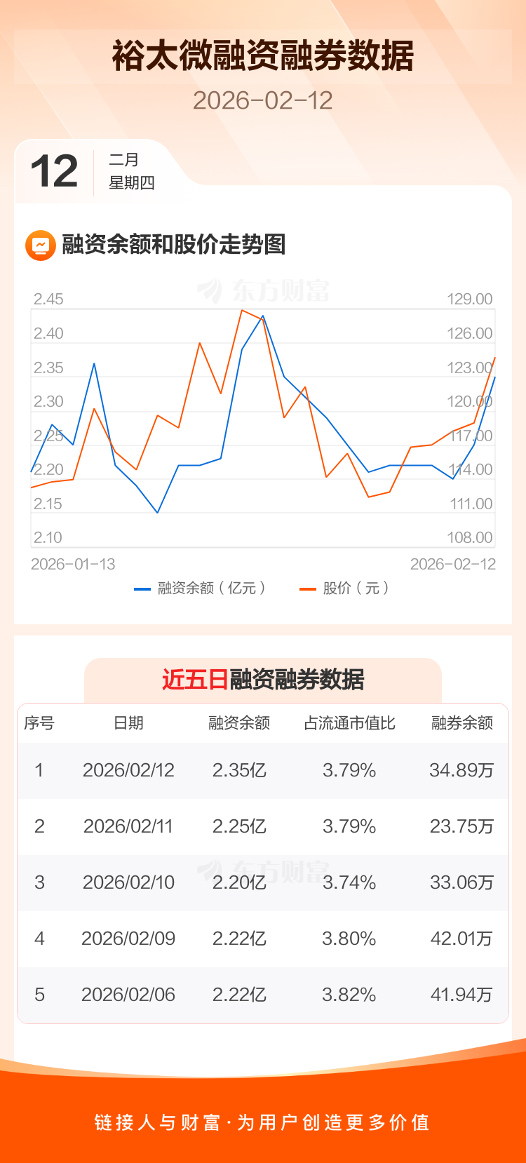 交易所最新数据显示,裕太微于2026年2月12日获融资买入2999.87万元,融资偿还1928.46万元,当日融资净买入1071.41万元。目前,该股融资余额2.35亿,占流通市值比例为3.79%。