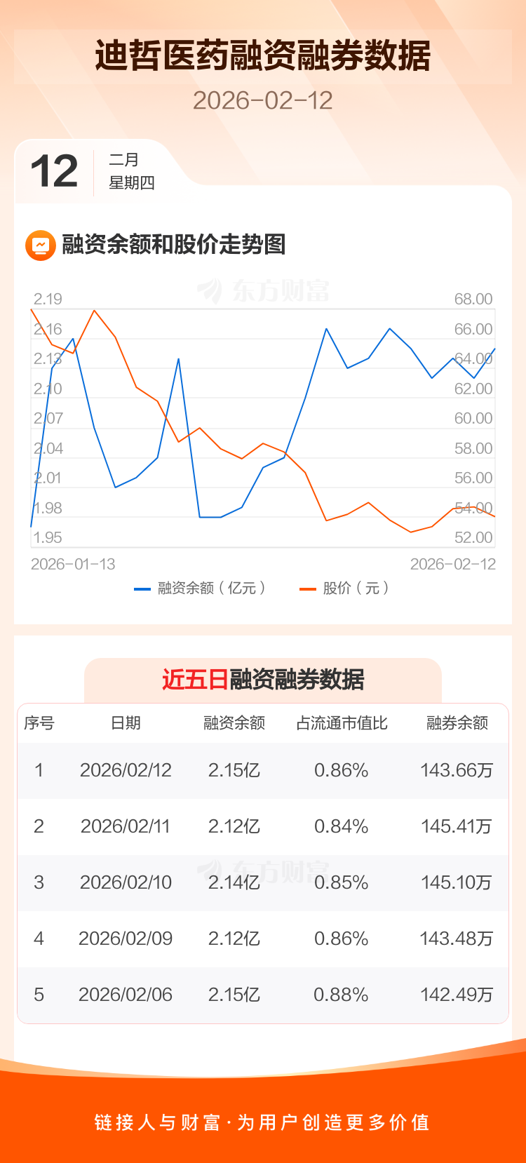 交易所最新数据显示,迪哲医药于2026年2月12日获融资买入585.32万元,融资偿还351.68万元,当日融资净买入233.64万元。目前,该股融资余额2.15亿,占流通市值比例为0.86%。