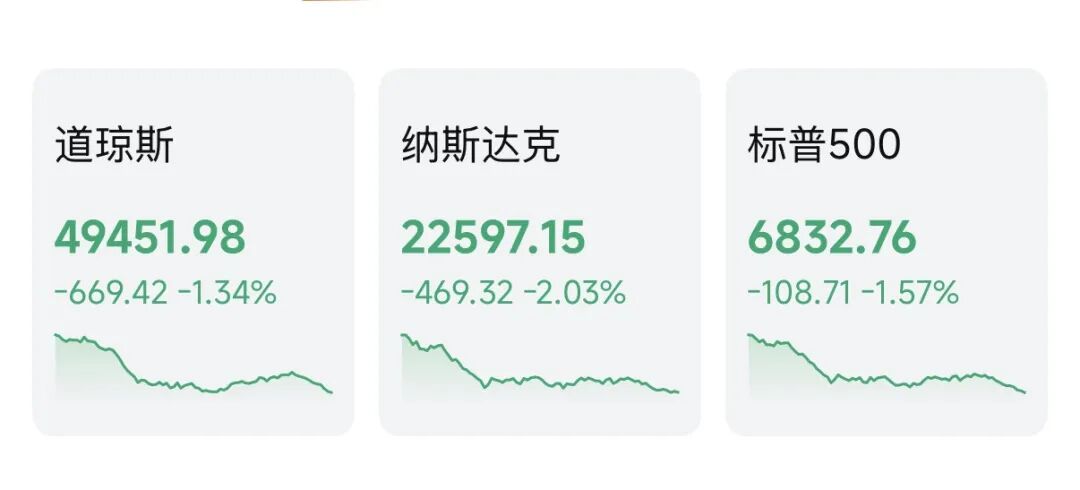 截至收盘,道指跌1.34%,跌669.42点,报49451.98点;标普500指数跌1.57%,报6832.76点;纳指跌2.03%,报22597.15点。