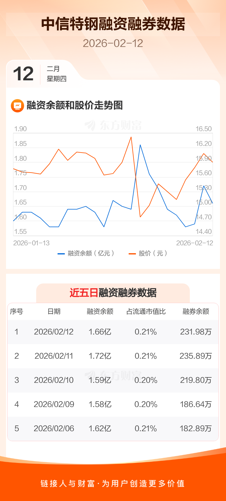 交易所最新数据显示,中信特钢于2026年2月12日获融资买入1531.13万元,融资偿还2132.30万元,当日融资净偿还601.18万元。目前,该股融资余额1.66亿,占流通市值比例为0.21%。