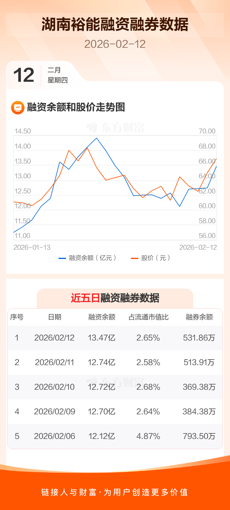 交易所最新数据显示,湖南裕能于2026年2月12日获融资买入2.25亿元,融资偿还1.53亿元,当日融资净买入7232.14万元。目前,该股融资余额13.47亿,占流通市值比例为2.65%。