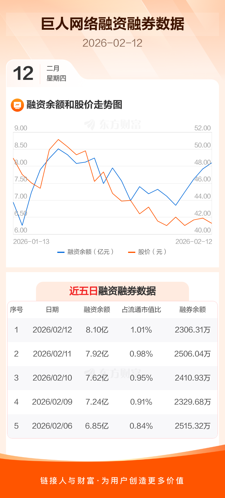 交易所最新数据显示,巨人网络于2026年2月12日获融资买入7570.86万元,融资偿还5706.53万元,当日融资净买入1864.32万元。目前,该股融资余额8.10亿,占流通市值比例为1.01%。