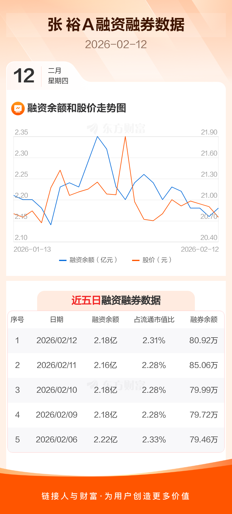 交易所最新数据显示,张 裕A于2026年2月12日获融资买入391.53万元,融资偿还245.13万元,当日融资净买入146.4万元。目前,该股融资余额2.18亿,占流通市值比例为2.31%。