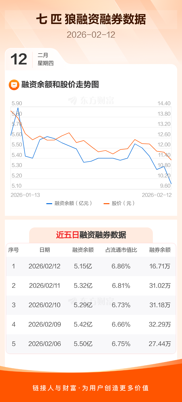 交易所最新数据显示,七 匹 狼于2026年2月12日获融资买入3682.57万元,融资偿还5411.62万元,当日融资净偿还1729.05万元。目前,该股融资余额5.15亿,占流通市值比例为6.86%。