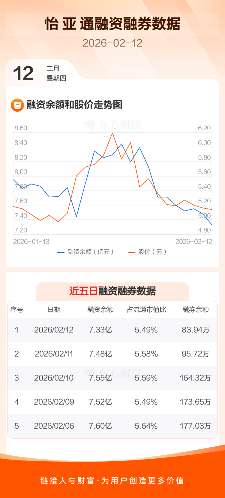 交易所最新数据显示,怡 亚 通于2026年2月12日获融资买入1921.64万元,融资偿还3470.35万元,当日融资净偿还1548.71万元。目前,该股融资余额7.33亿,占流通市值比例为5.49%。