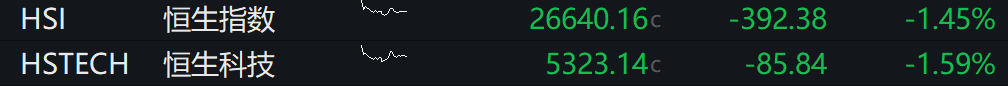 恒生指数低开1.45%,恒生科技指数跌1.59%。科网股全线走低,腾讯音乐跌逾6%,紫金矿业、百度集团、哔哩哔哩跌逾3%。