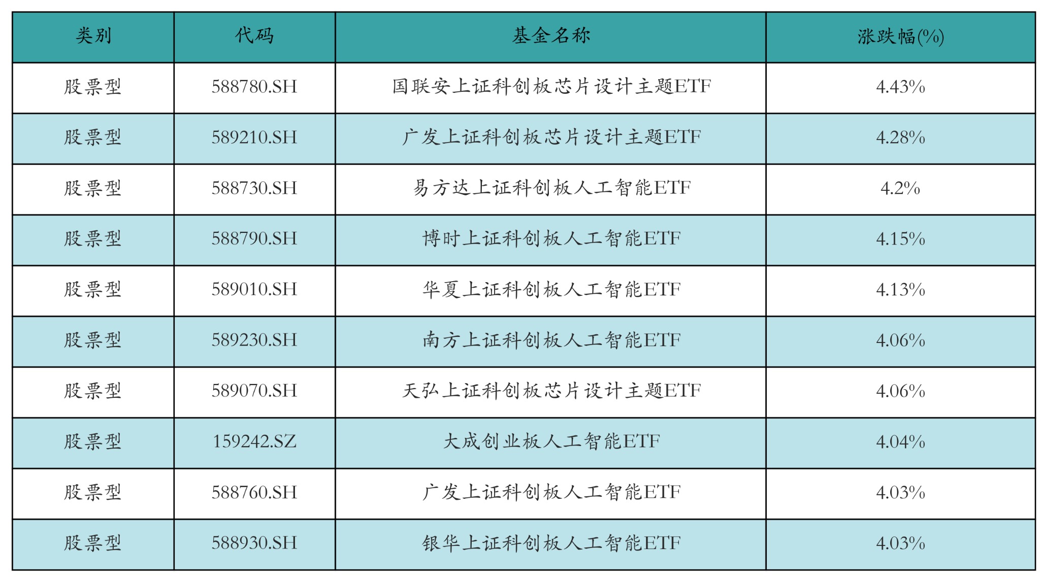 昨日股票型ETF涨幅最高的3只ETF及其收益率分别为:国联安上证科创板芯片设计主题ETF(4.43%)、广发上证科创板芯片设计主题ETF(4.28%)、易方达上证科创板人工智能ETF(4.2%)。涨幅前10详情见下表: