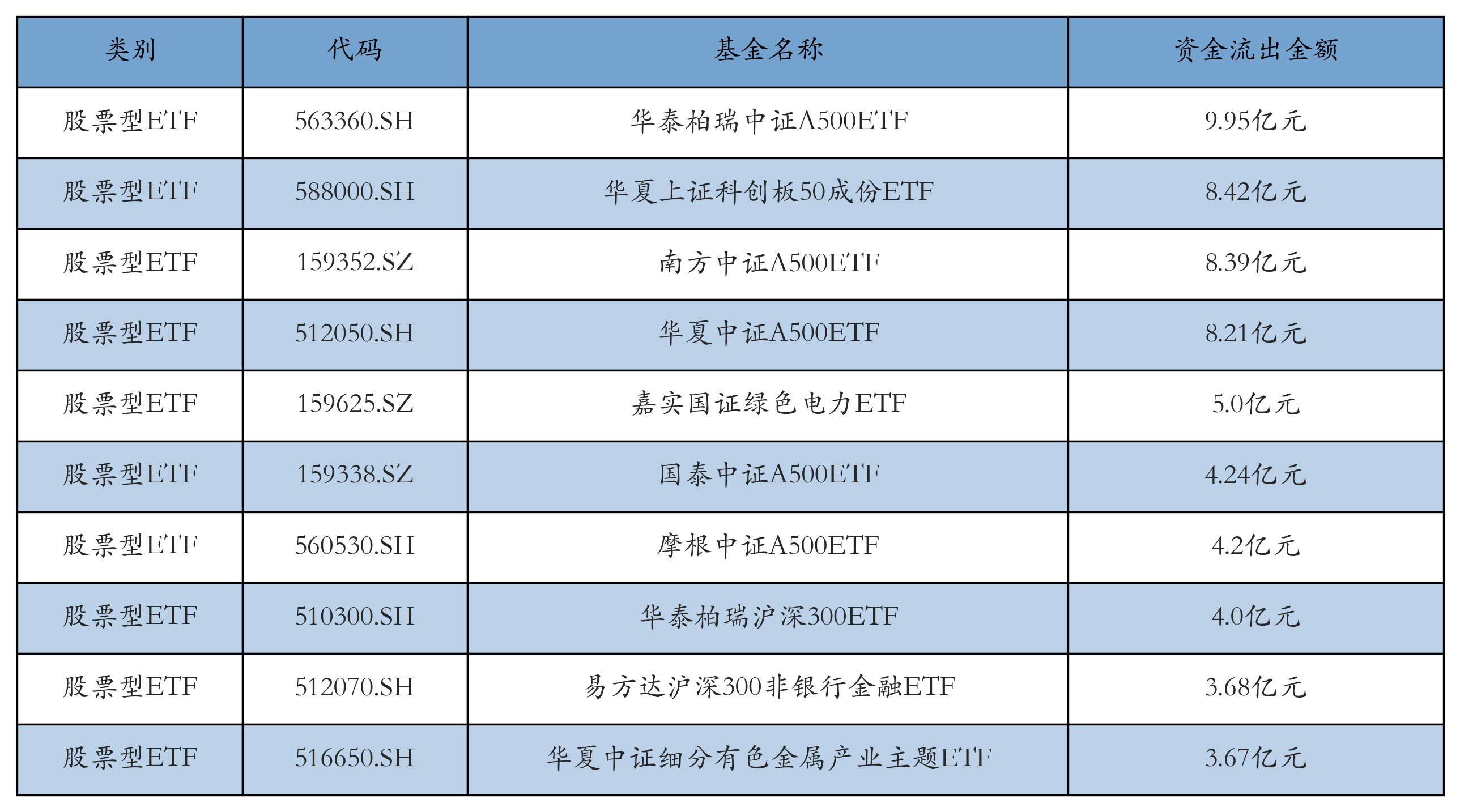 昨日股票型ETF资金流出最多的3只ETF及其流出金额分别为:华泰柏瑞中证A500ETF(流出9.95亿元)、华夏上证科创板50成份ETF(流出8.42亿元)、南方中证A500ETF(流出8.39亿元)。资金流出前10详情见下表: