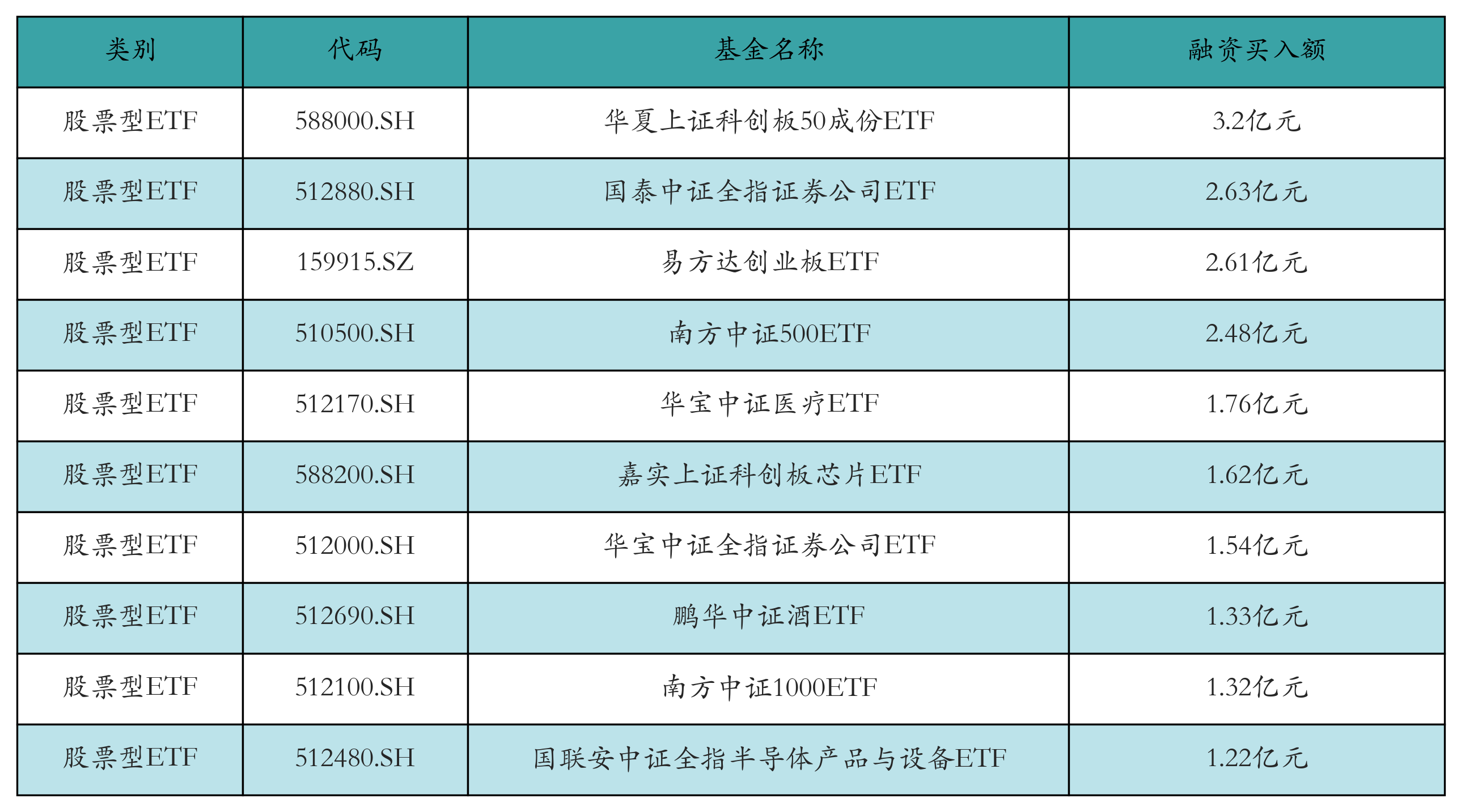 昨日股票型ETF融资买入额最高的3只ETF及其买入金额分别为:华夏上证科创板50成份ETF(3.2亿元)、国泰中证全指证券公司ETF(2.63亿元)、易方达创业板ETF(2.61亿元)。融资买入额前10详情见下表:
