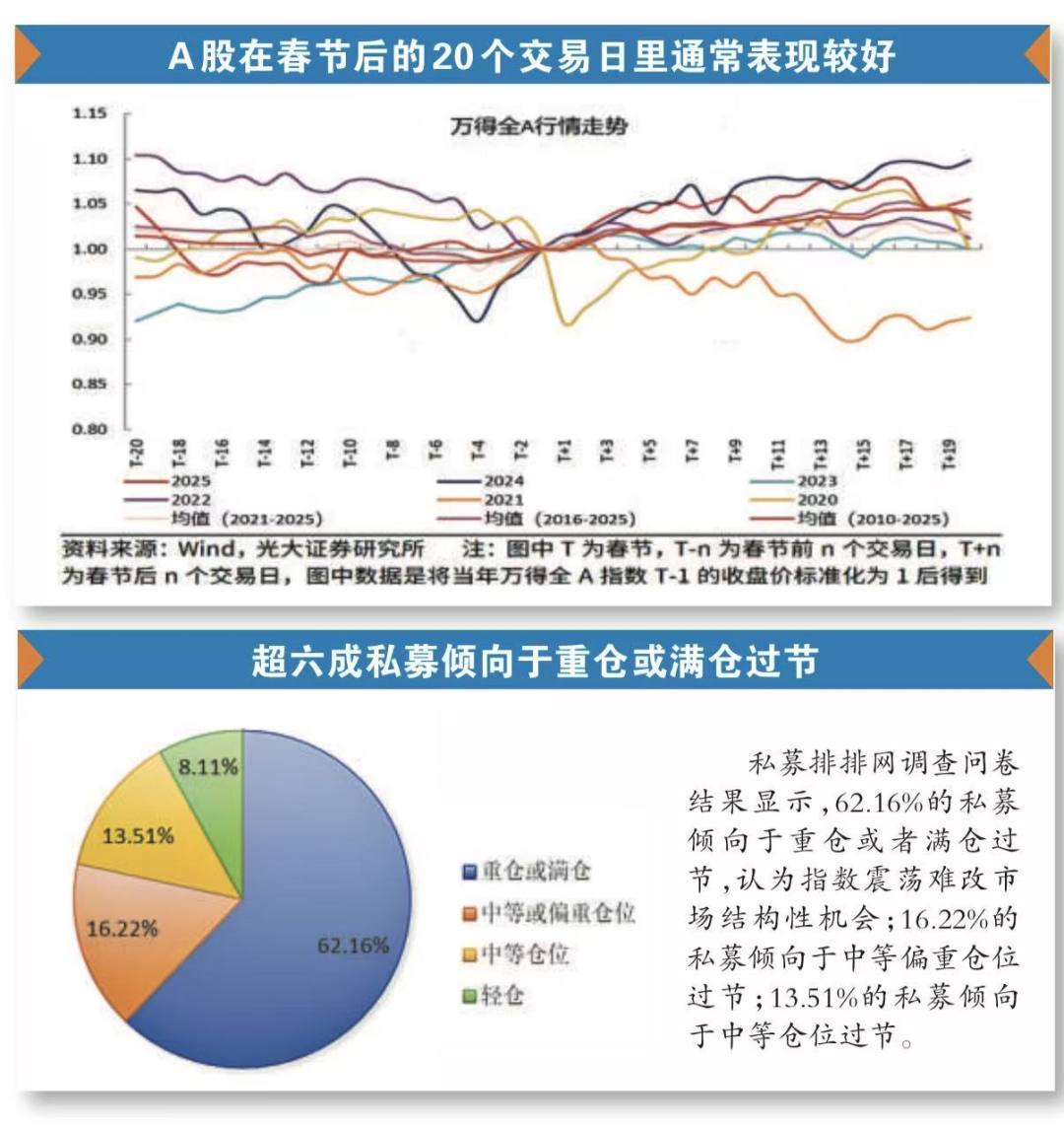 “春节期间要是外围市场突变,那说不定假期心情都可能受影响。”投资者小陈表示,今年春节假期有9天,更加担心外部市场风险。对此,华金证券认为,春节期间经济和盈利预期有望改善,春节出行、消费数据或表现较佳。而春节期间市场风险偏好可能维持中性,外部地缘政治扰动仍存,但对国内市场影响有限。与此同时,春节后稳增长政策进一步落地的预期较强。因此,春季行情未完,春节期间风险扰动有限。