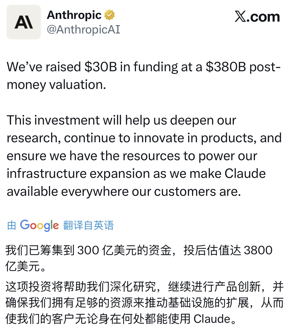 北京时间2月13日,OpenAI强有力的竞争对手Anthropic宣布完成G轮融资,共筹集300亿美元,投后估值达3800亿美元(约合人民币2.6万亿元)。
