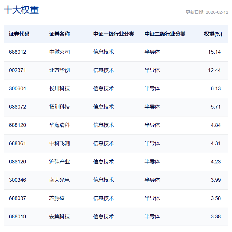 从投资布局角度看,半导体设备赛道专业性强、细分环节多,个股波动较大,通过ETF布局可分散风险,把握行业整体机遇。半导体设备ETF(159516)持仓集中于刻蚀、薄膜沉积、清洗、量测等环节的国内龙头企业,同时在半导体材料领域也有布局,涵盖硅片、光刻胶、特种气体等关键材料公司。