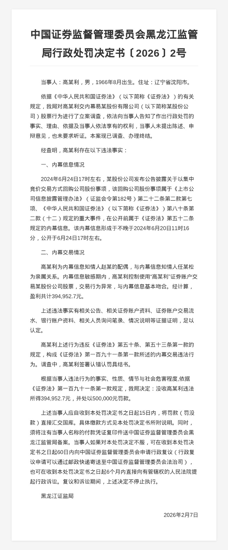 蓝鲸新闻2月13日讯,近日,黑龙江证监局发布了一则行政处罚决定书,剑指高某利。