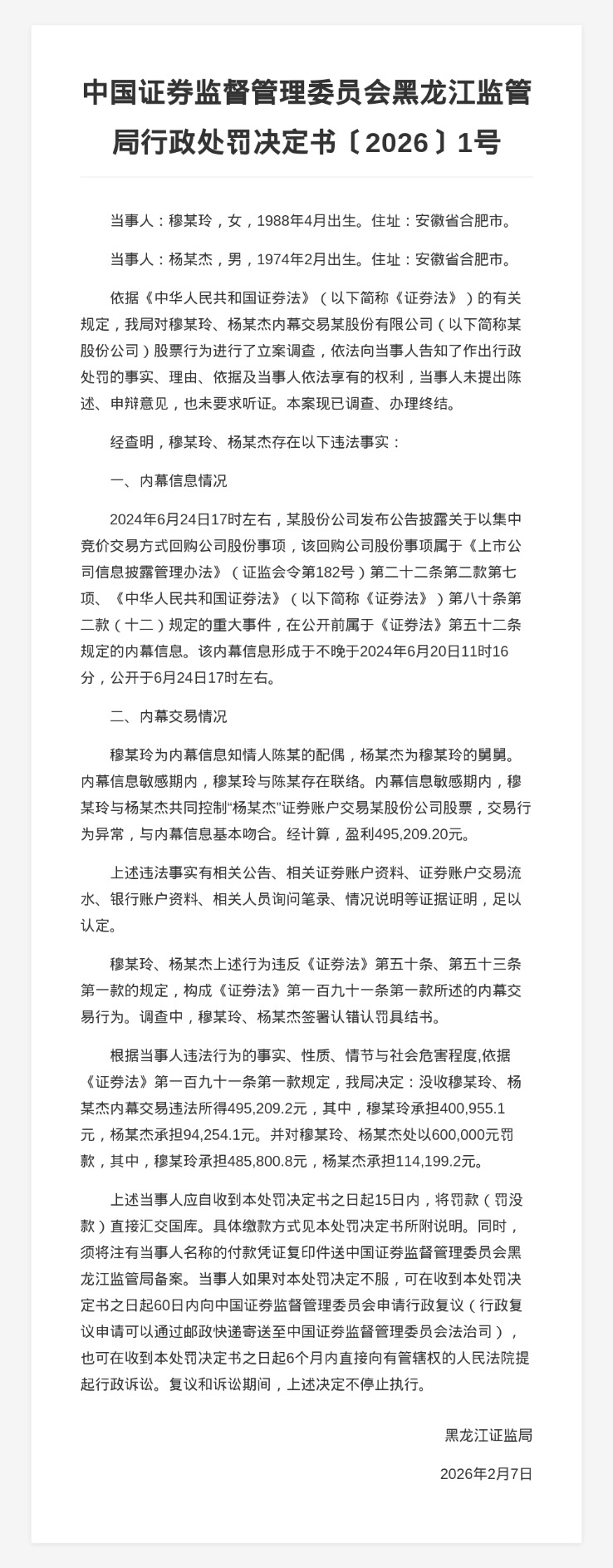 蓝鲸新闻2月13日讯,近日,黑龙江证监局发布行政处罚决定书,剑指穆某玲、杨某杰。
