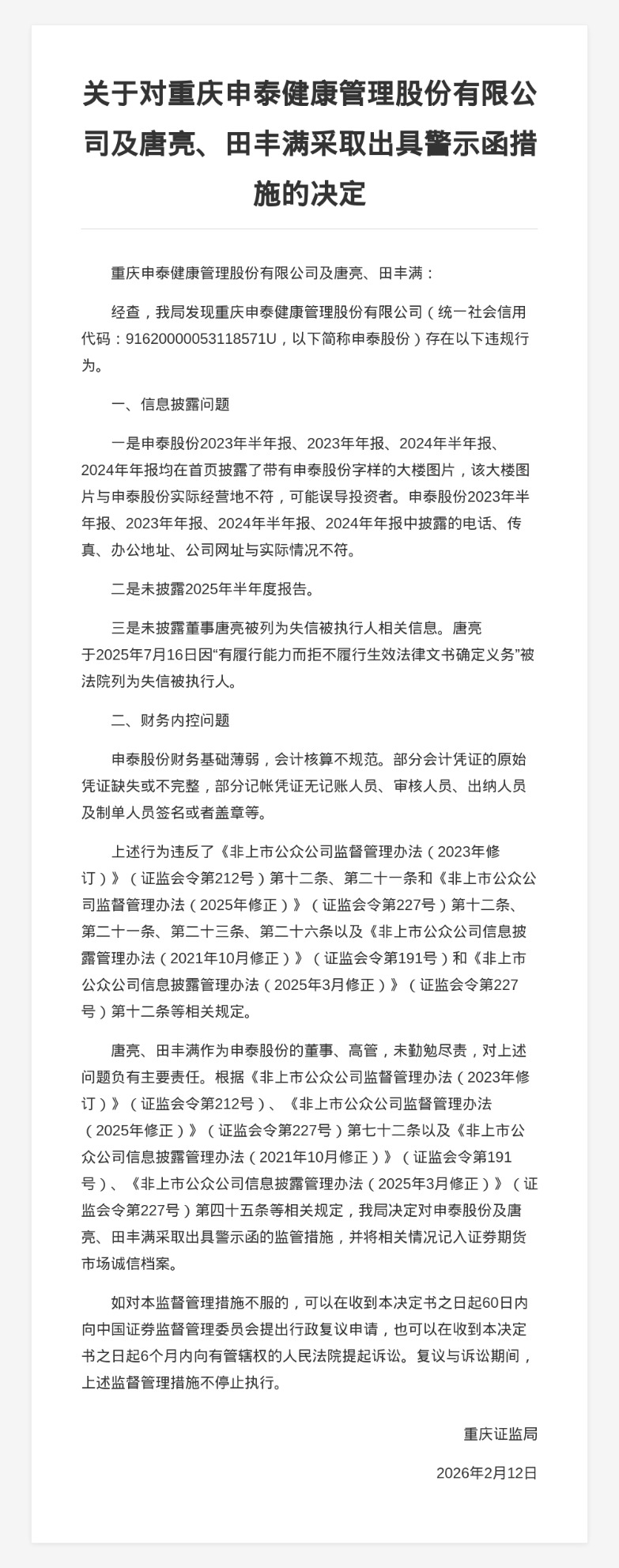 蓝鲸新闻2月13日讯,近日,重庆证监局发布行政监管措施决定书,剑指重庆申泰健康管理股份有限公司及唐亮、田丰满。