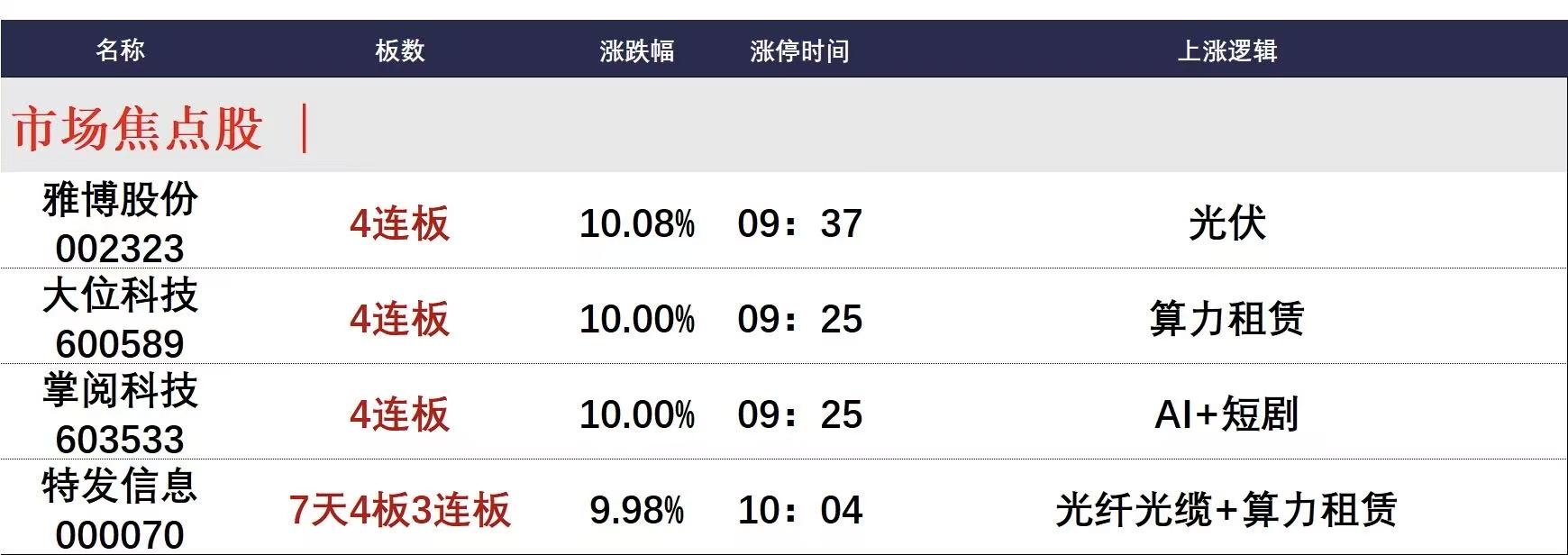 今日午盘全市场共30股涨停,连板股总数5只,10股封板未遂,封板率为75%(不含ST股、退市股)。焦点股方面,AI应用端的掌阅科技5连板、风语筑5天3板。