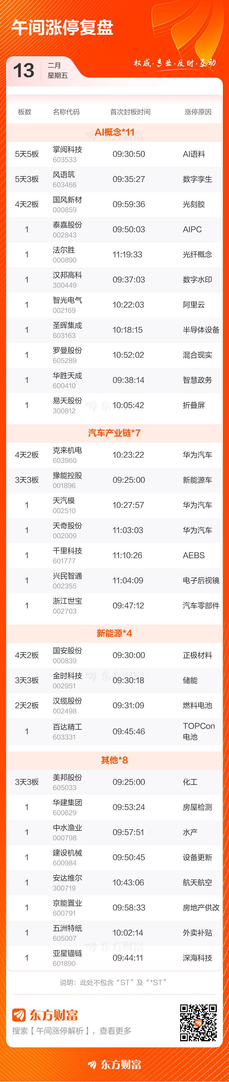 2月13日午间涨停复盘:39股涨停 掌阅科技5天5板