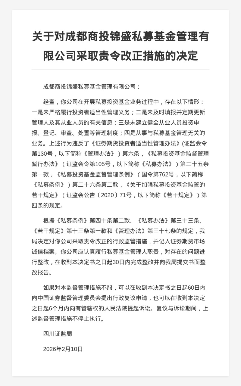 对此,四川证监局决定对成都商投锦盛私募基金管理有限公司采取责令改正的行政监管措施,并记入证券期货市场诚信档案。
