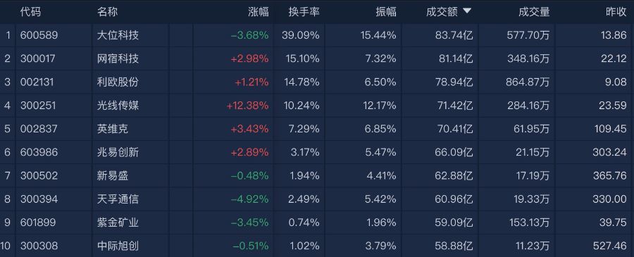 个股方面,大位科技半日成交额超83亿元居首位,网宿科技、利欧股份、光线传媒等公司成交额靠前。