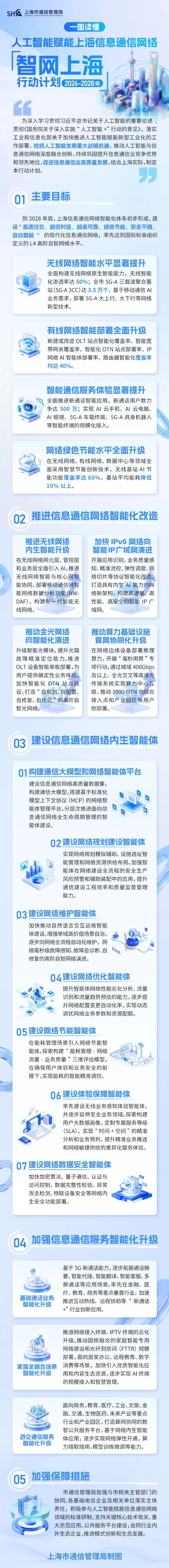 据上海市通信管理局消息,《人工智能赋能上海信息通信网络“智网上海”行动计划(2026-2028年)》正式发布。目标到2028年底,上海信息通信网络智能化体系初步形成,建设“高速泛在、超低时延、超高可靠、绿色节能、安全平稳、自动智能”的现代化信息通信网络,率先达到国际标准组织定义的L4高阶自智网络水平。