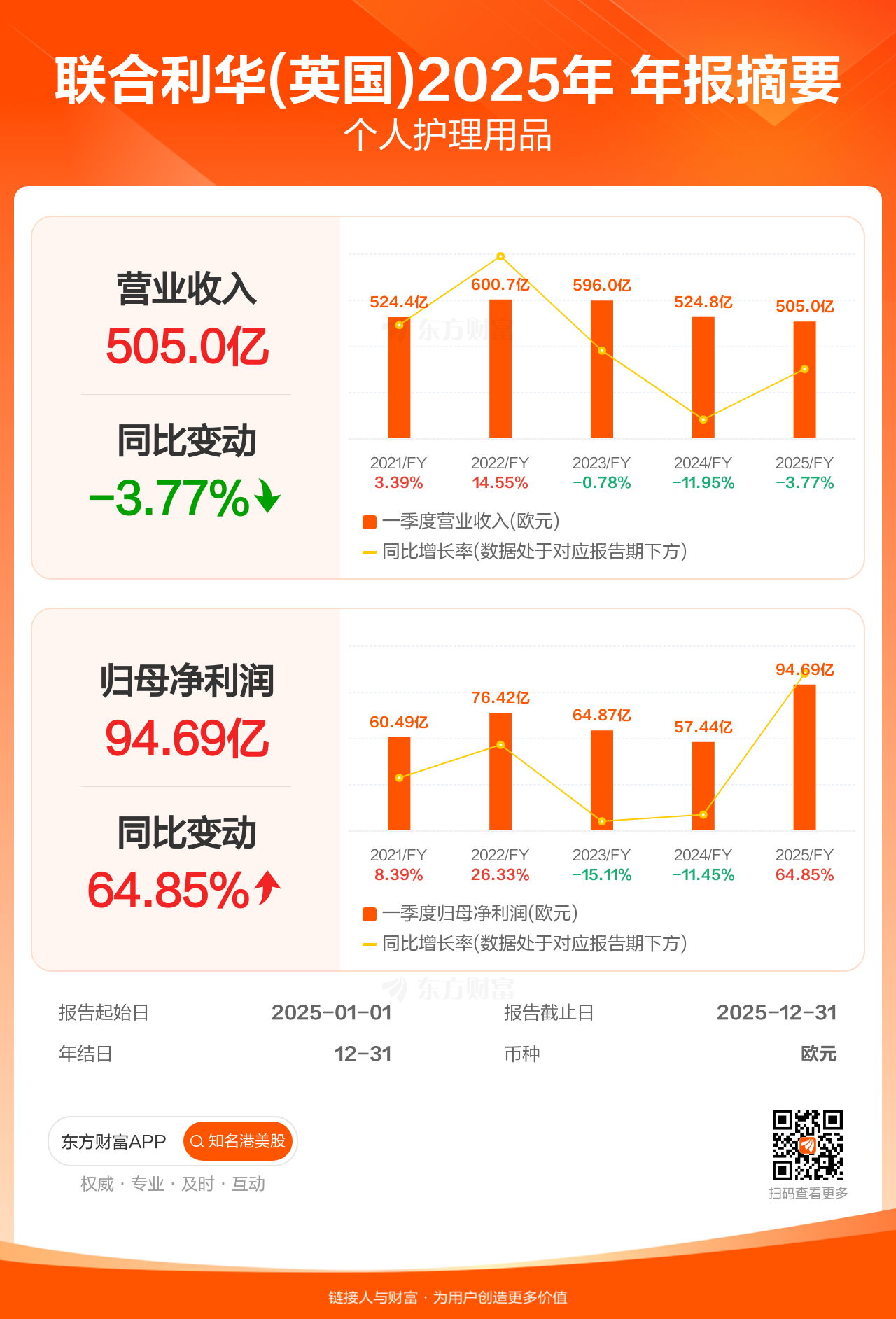 联合利华(英国)2月12日发布年报业绩,截至2025年12月31日的12个月内,该公司营业收入505.03亿欧元,同比减少3.77%;公司权益持有人应占溢利(归母净利润)94.69亿欧元,同比增长64.85%。