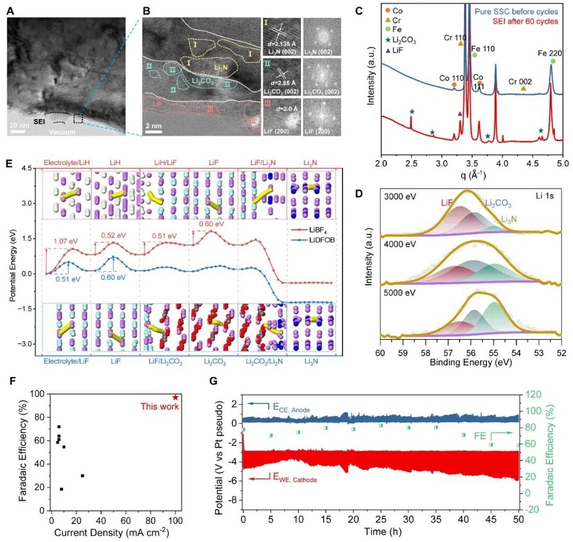 锂介导氮还原合成氨技术面临的核心挑战在于:SEI层离子传导率低下,导致高电流密度下锂离子传输受阻。为突破这一瓶颈,研究团队创新性地设计了一种功能分层的混合SEI结构:通过构建具有低离子结合能的外层促进锂离子去溶剂化,同时在富含离子传导域的内层实现高效锂离子传输。该设计成功将锂离子通量提升两个数量级,在连续流反应体系中实现了100 mA cm-2的高电流密度下稳定运行。