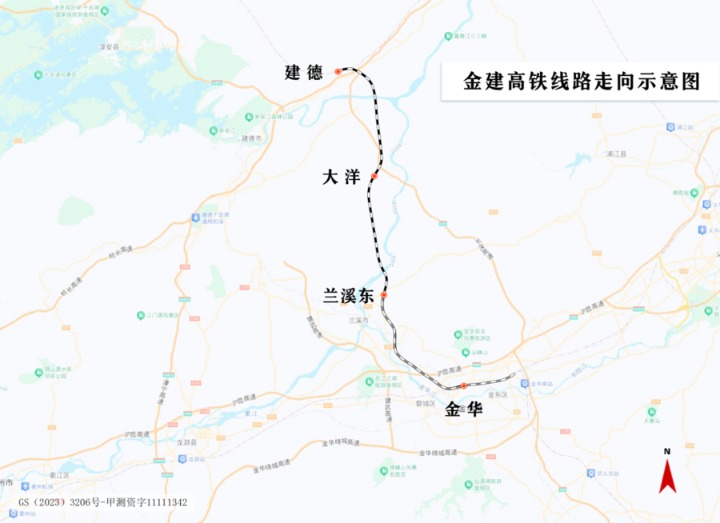 金建高铁起自金华市金东区,向北经兰溪市、建德市,在建德站接入杭昌高铁杭黄段,正线全长64.51公里,设计时速250公里。沿线设金华、兰溪东、大洋、建德4座车站,其中兰溪东站和大洋站为新建车站。金建高铁实行分段开通,此次开通的金建高铁兰建段全长约44公里,兰溪东、大洋2座新站投入办理客运业务。